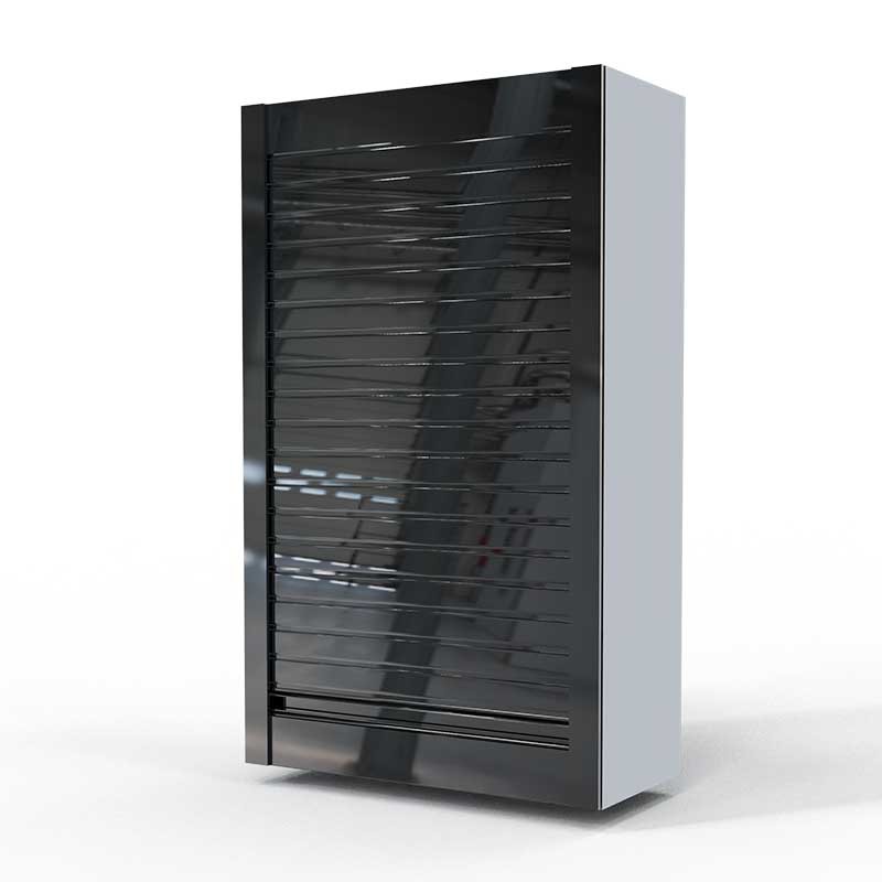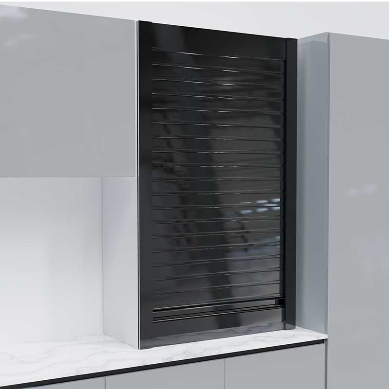 Expanda Persiana em kit para armário de cozinha fabricada com ripas de 40 mm de vidro temperado acabamento preto brilho e 4 mm de espessura com perfis de alumínio Cor Preto Brilho.