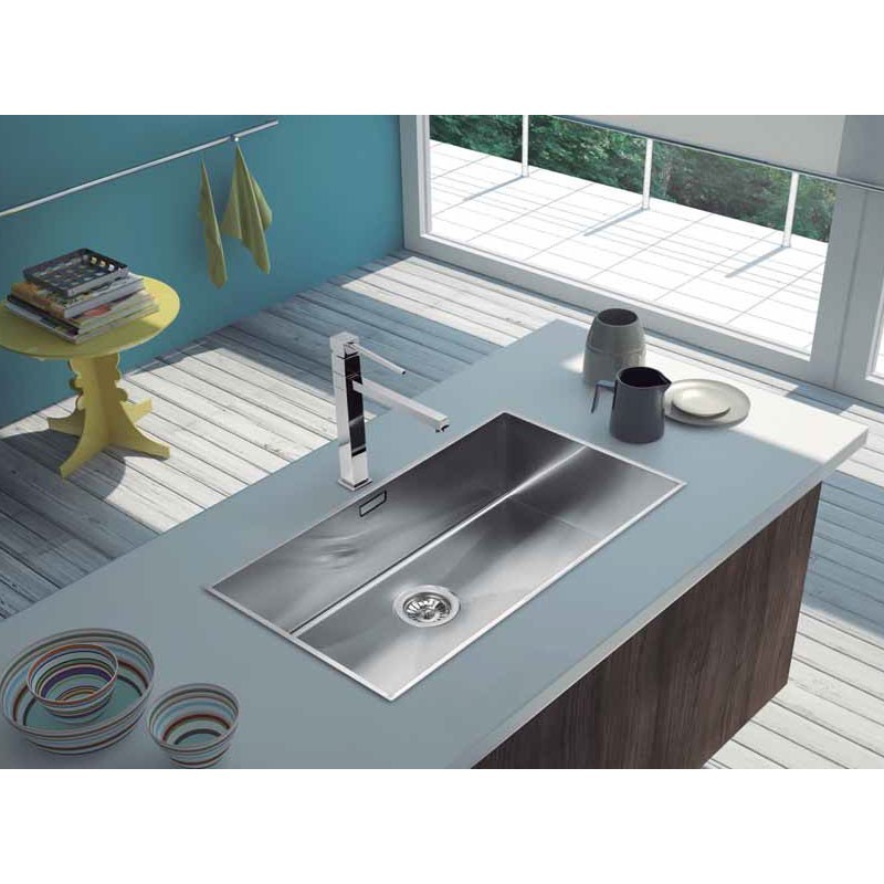 A cuba é instalada por baixo da bancada e fica perfeitamente nivelada com a superfície, graças a um rebaixo perimetral. O resultado é uma superfície contínua, elegante e fácil de limpar, sem bordas salientes.