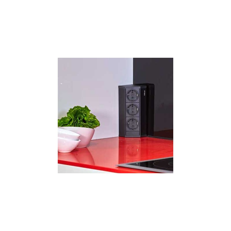 Pode ser fixado em um ângulo de 90º, aproveitando um canto, ou colocado sob os móveis da cozinha ou banheiro. Também é muito usado para interiores de móveis persianas para conectar a cafeteira, liquidificador ou outros utensílios.