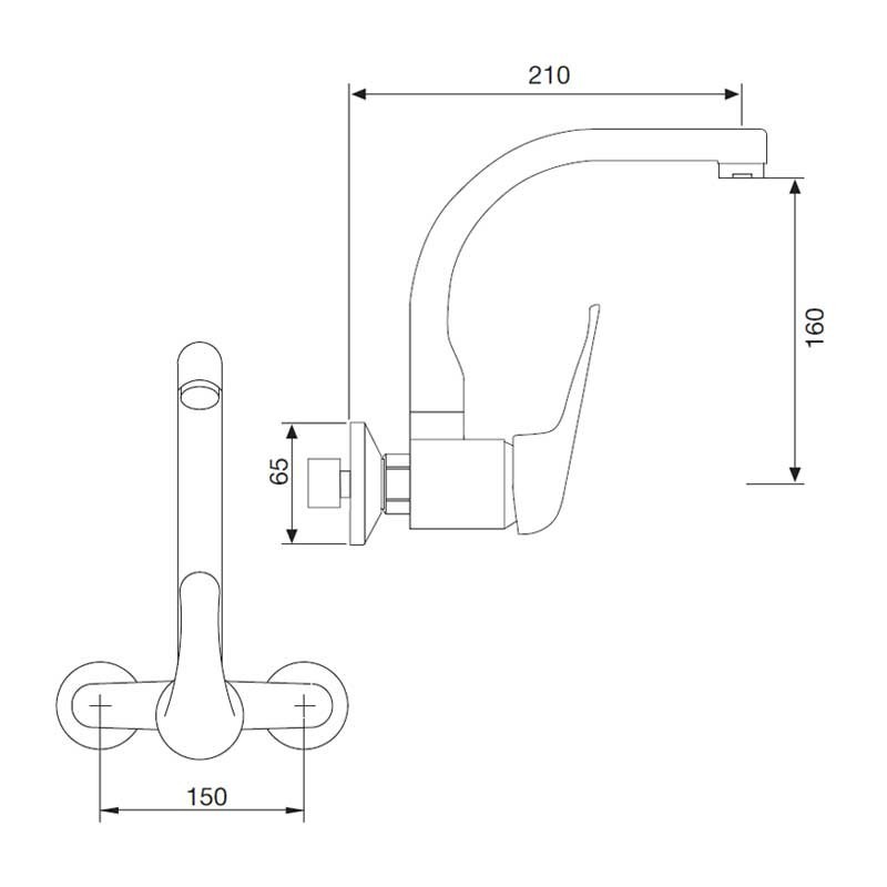 Torneira monocomando modelo Padrão acabamento cromado para pia de cozinha. Cartucho cerâmico de 40 mm Desenho de um mural para instalação em parede. Distância entre tiros: 15 cm