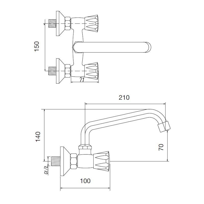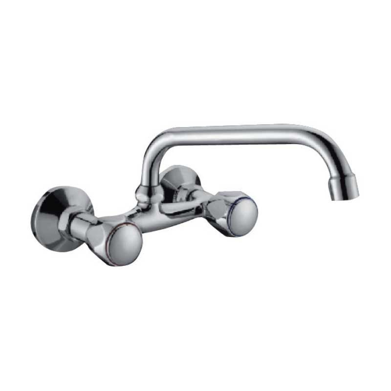 Torneira bimando armação de cerâmica modelo Aida acabamento cromado para pia de cozinha. Projeto tipo mural para instalação em parede. Distância entre tiros: 15 cm