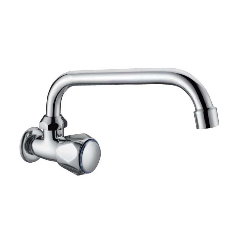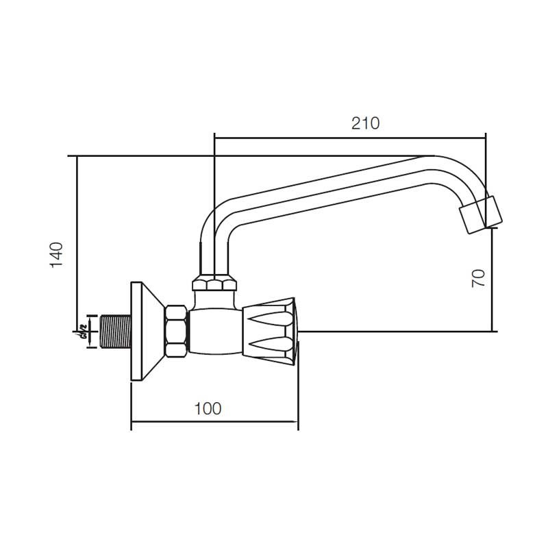 Faucet 1 saída para água fria e bica sob o modelo Aida de 14 cm de altura e acabamento cromado para pia ou pilha lavanderia. Projeto tipo mural para instalação em parede.
