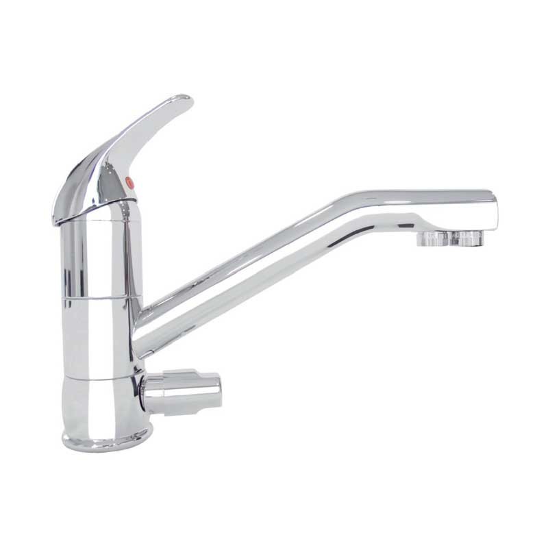 Torneira de dupla função, 3 vias, dupla saída (rede de água e água de osmose) e poste baixo de 19,5 cm de altura, acabamento cromado para pia de cozinha. Cartucho cerâmico de 40 mm de entrega fixa para a água convencional e montagem cerâmica para água osmotizada.