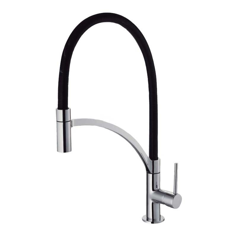 Torneira misturadora com bico flexível tipo mola modelo Alcor de 45,7 cm de altura e acabamento preto-cromo para pia de cozinha. Instalação vertical sobre a borda.